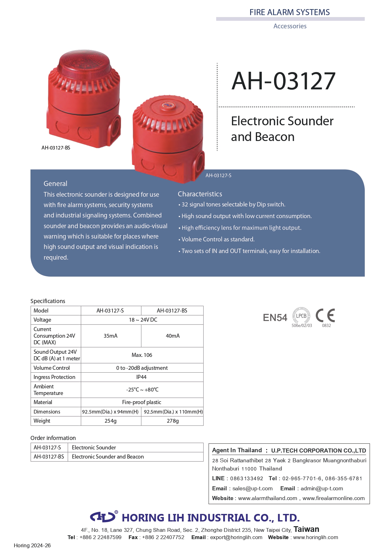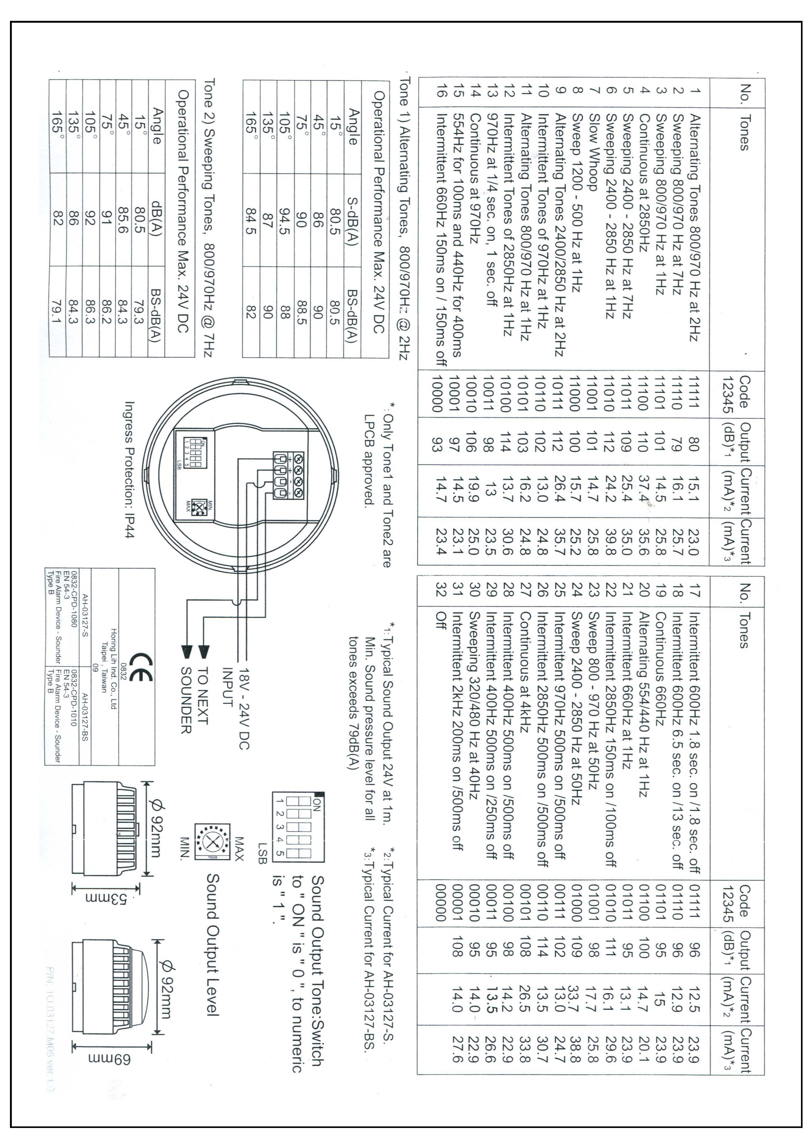 สามารถปรับความดังและปรับเสียงได้ 32 เสียง ความดังสูงสุด 106 dB ที่ 1 เมตร ใช้ไฟ 24 VDC